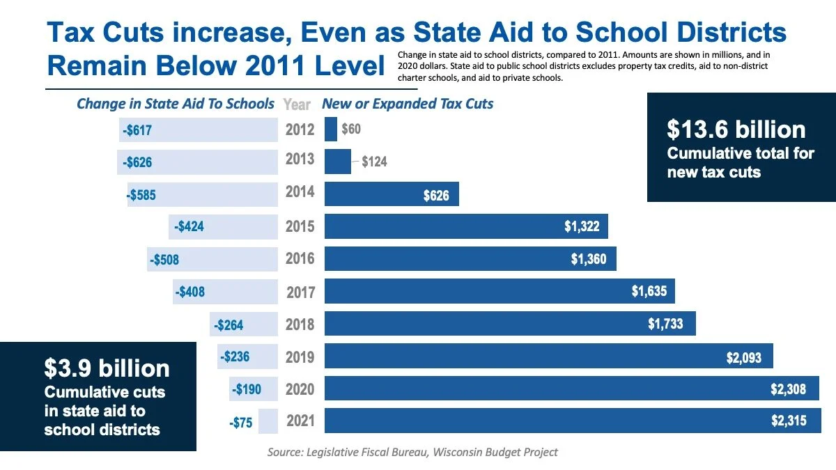 The graphic below shows the comparison of tax cuts to state aid for Wisconsin School Districts, from 2012-21.